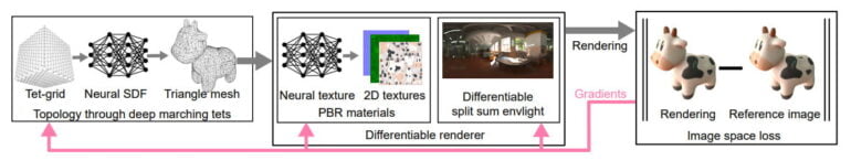Nvidias 3D MoMa lernt stattdessen Topologie, Materialien und Umgebungsbeleuchtung aus 2D-Aufnahmen mit separaten Netzen, darunter eines für Texturen und eines, das unter anderem SDF-Werte (Signed Distance Field) aus einem wandernden Tetraeder-Gitter lernt.