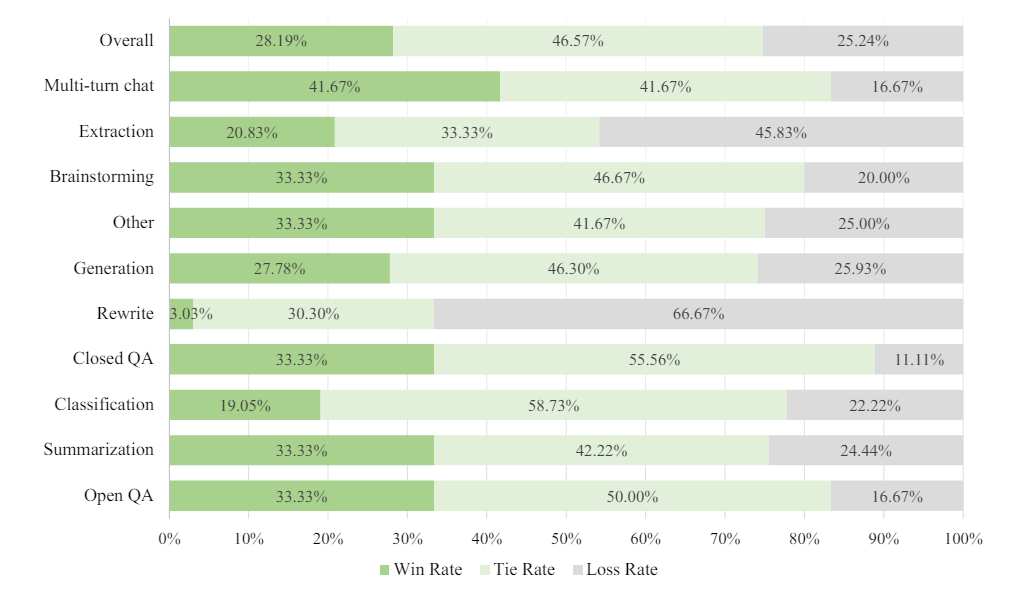 Es ist auch vergleichbar oder besser als GPT-4-1106 von OpenAI bei der menschlichen Bewertung für verschiedene Textaufgaben wie Zusammenfassungen und Brainstormings. Detaillierte Benchmarks sind im technischen Report verfügbar.