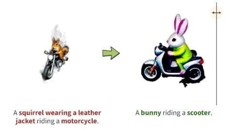 Magic3D bietet zudem für Bild-KI-Systeme typische Editierungsfunktionen, die auf den 3D-Generierungsprozess übertragen werden können. So können Texteingaben nach der ersten Grob-Generierung für die Fein-Generierung angepasst werden: Aus einem Eichhörnchen auf einem Fahrrad wird etwa ein Hase auf einem Roller.