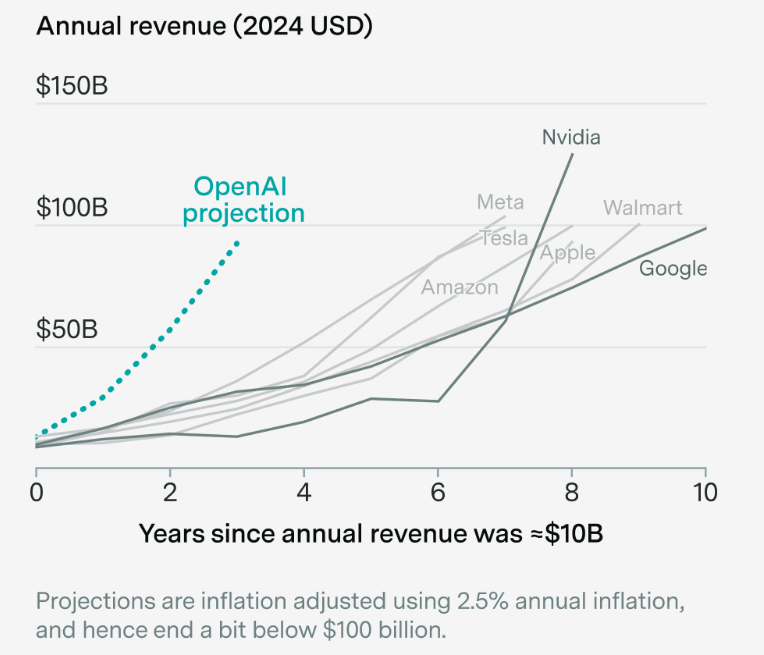 OpenAI plant ein Wachstumstempo, das es so noch nicht gegeben hat. Eine aktuelle Analyse von Epoch AI zeigt, wie ehrgeizig die Umsatzprognosen des Unternehmens sind. Demnach will OpenAI seinen Umsatz von 13 Milliarden Dollar im Jahr 2025 auf 100 Milliarden Dollar bis 2028 steigern – ein Wachstum, für das es laut Epoch AI kein historisches Vorbild gibt. Bisher gelang es nur sieben US-Firmen, innerhalb eines Jahrzehnts von 10 auf 100 Milliarden zu wachsen.