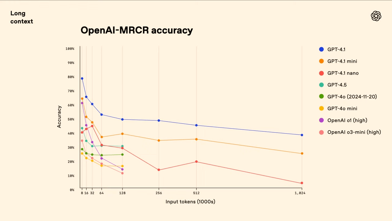 Wenngleich sich GPT-4.1 hier an die Spitze setzt, offenbart die Grafik auch den dramatischen Leistungsabfall von 80 auf rund 50 Prozent bei vollständiger Nutzung des Kontextfensters. In einer Demo während des Livestreams benötigte GPT-4.1 weit mehr als eine Minute, um eine nachträglich eingefügte Zeile aus einer 450.000 Token langen Log-Datei zu identifizieren.