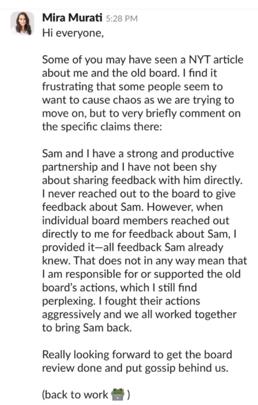 "Ich habe die Handlungen aggressiv bekämpft und wir haben alle daran gearbeitet, Sam zurückzuholen", schreibt Murati in einer internen Nachricht.