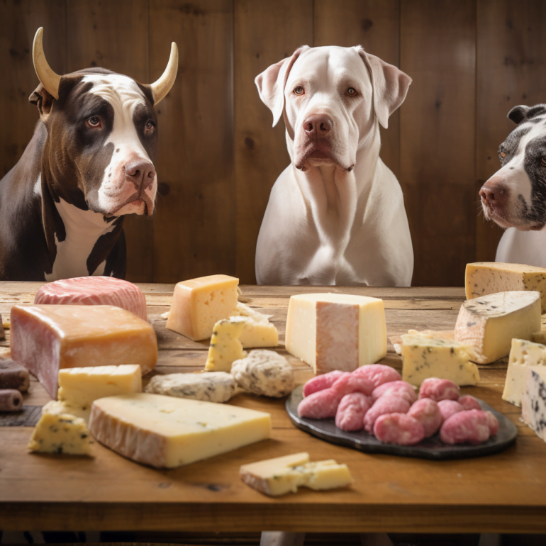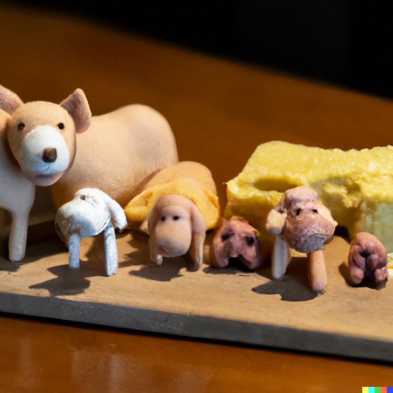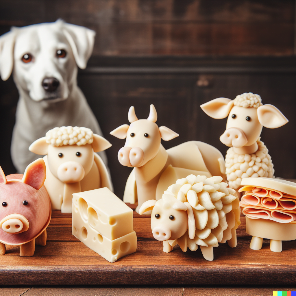 Das folgende Midjourney-Beispiel mit dem gleichen Prompt zeigt den Concept Spillover. Hier ist einerseits der Käse nicht zum Tier geworden, andererseits hat ein Hund Kuhhörner (aus Käse?) auf.