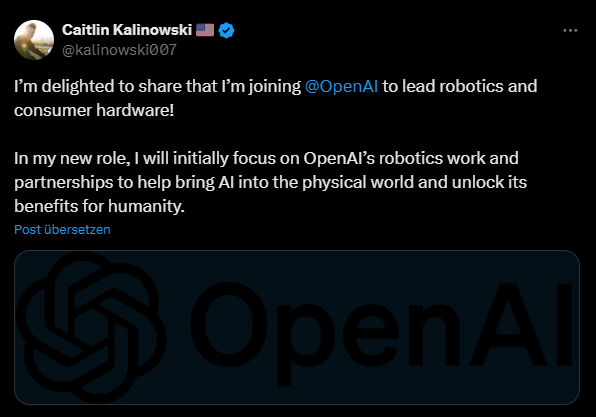 "In meiner neuen Rolle werde ich mich zunächst auf OpenAIs Robotik-Arbeit und Partnerschaften konzentrieren, um KI in die physische Welt zu bringen", erklärt Kalinowski auf X.