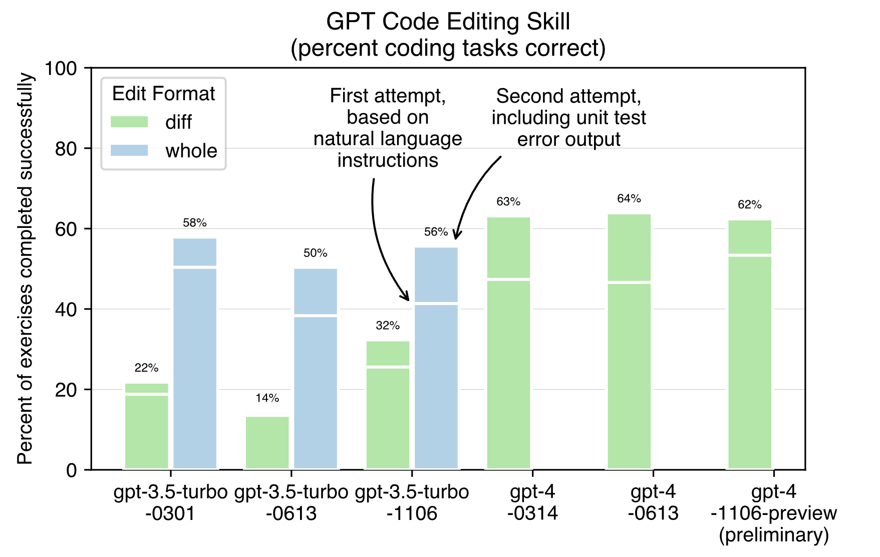 Aider, ein weiterer KI-Assistent für die Coding, hat das neue Modell ebenfalls mit Coding-Aufgaben getestet. Demnach ist GPT-4 Turbo erwartungsgemäß deutlich schneller als die bisherigen GPT-4-Modelle. Genaue Messungen sind aufgrund der derzeitigen Einschränkungen von OpenAI noch nicht möglich. Außerdem scheint es besser darin zu sein, beim ersten Versuch korrekten Code zu erzeugen. Es löst 53 % der Codeaufgaben, während frühere Modelle nur 46-47 % der Aufgaben beim ersten Versuch lösen. Zudem scheint GPT-4 Turbo im Allgemeinen ähnlich gut zu funktionieren (~62 %) wie die alten Modelle (63-64 %), nachdem sie eine zweite Chance zur Fehlerkorrektur erhalten haben, indem sie die Fehlerausgabe der Testsuite überprüfen.