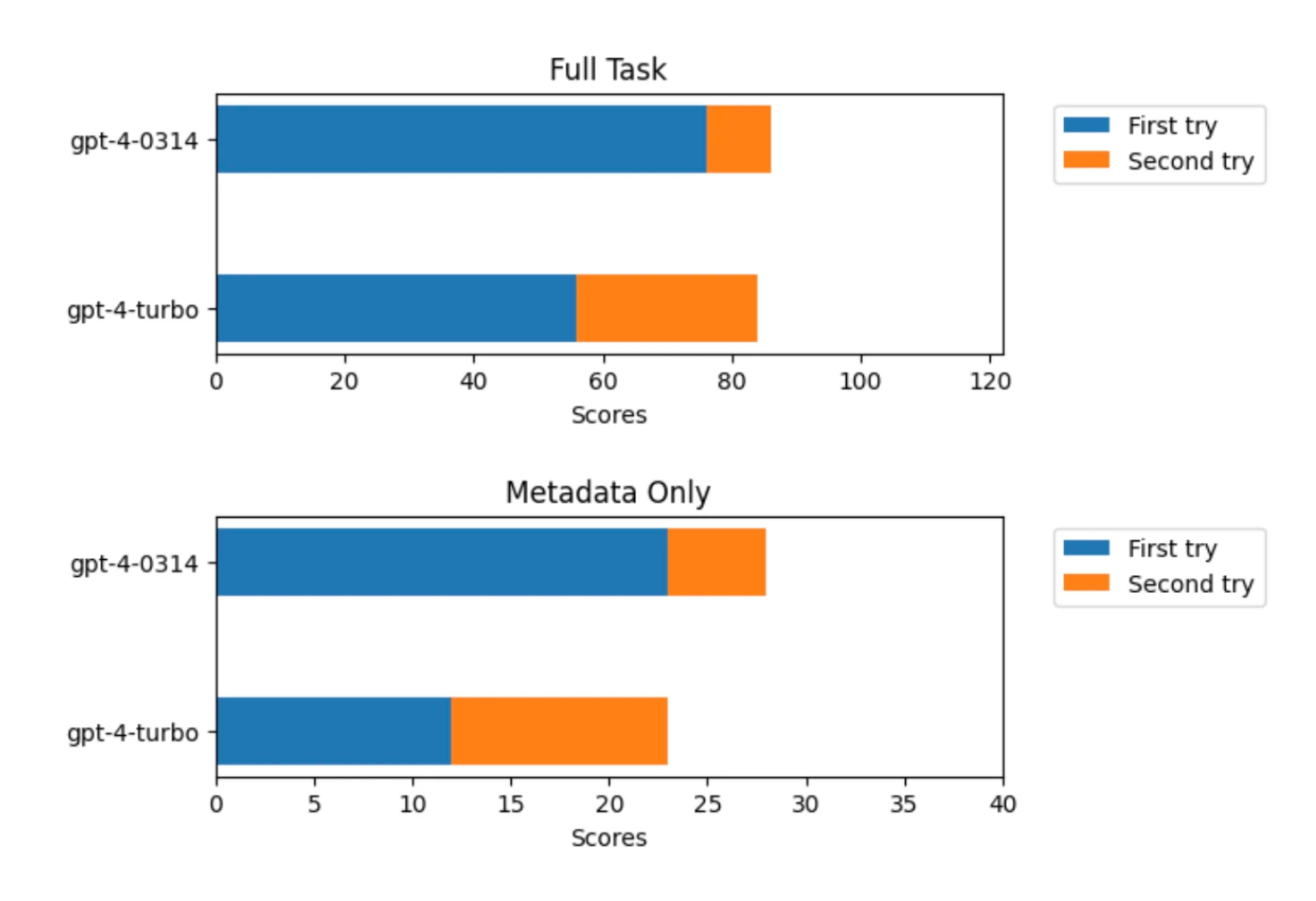 Beispielsweise haben die Entwickler von Mentat AI, einem KI-basierten Coding-Assistenten, das neue Modell in Coding-Aufgaben getestet. GPT-4 (gpt-4-0314) löste 86 von 122 Aufgaben, während GPT-4 Turbo (gpt-4-1106-preview) 84 von 122 Aufgaben löste. Ein genauerer Blick auf die Ergebnisse zeigte jedoch, dass GPT-4 76 Aufgaben im ersten Versuch und 10 im zweiten Versuch löste, während GPT-4 Turbo nur 56 Aufgaben im ersten Versuch und 28 im zweiten Versuch löste.
