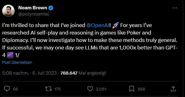 Ein ähnliches Phänomen wurde bei der Poker-KI Libratus beobachtet. Noam Brown, einer der Autoren des Papiers, ist seit diesem Sommer bei OpenAI beschäftigt und hat auf Twitter.com einen Beitrag über die Bedeutung des Kompromisses zwischen Trainingszeit und Testzeit veröffentlicht.