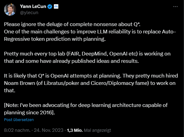 Neben Sprachmodellen setzt Q* wohl auf eine nicht linearer Methode zur Erforschung von "Gedanken", ähnlich zu Tree-of-Thoughts, Monte-Carlo Tree Search (MCTS), den oben erwähnten PRMs und einem Lernalgorithmus wie Q-learning. Nvidias Jim Fan erklärt die Details in einem ausführlichen Post auf Twitter.com.