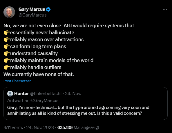 Gegenwärtige KI-Technologien wie ChatGPT von OpenAI sind in der Lage, Muster zu erkennen, aus ihnen rudimentäre Schlüsse zu ziehen und Antworten zu generieren, die auf zuvor gesehenen Mustern basieren. Allerdings fehlen ihr viele Fähigkeiten, die wir als zentral für die menschliche Intelligenz ansehen, wie etwa mehr oder weniger fundiertes logisches Denken. Ein anschauliches Beispiel: Ein Experiment zeigte kürzlich, dass Sprachmodelle die einfache Formel "A ist B" nicht zu "B ist A" verallgemeinern können.