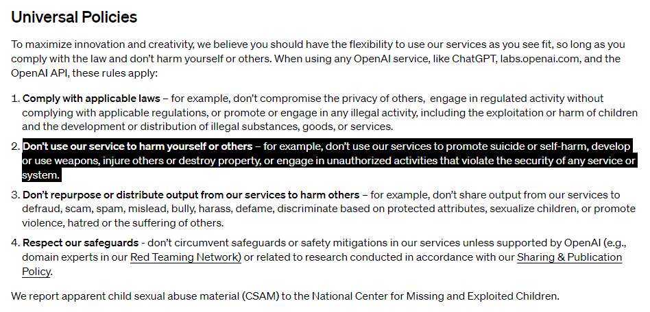 Die frühere Richtlinie verbot ausdrücklich die Durchführung von Aktivitäten mit OpenAI-Technologien und ChatGPT, die ein hohes Risiko für die körperliche Unversehrtheit darstellen, einschließlich der Entwicklung von Waffen und der militärischen Kriegsführung.