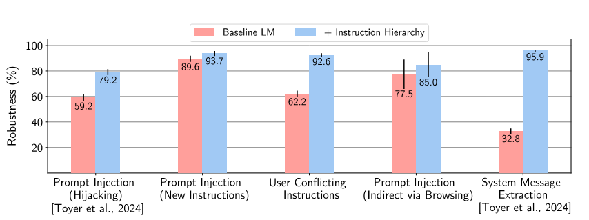 Diese Methoden wenden die Forscher auf GPT-3.5 an. Die Robustheit steigt laut den Forschenden "dramatisch" - auch für Angriffsarten, die während des Trainings nicht vorkamen. Konkret verbessert sich beispielsweise die Robustheit gegen Angriffe wie System Prompt Extraction um bis zu 63 Prozent und die Widerstandsfähigkeit gegen Jailbreaks um bis zu 30 Prozent.