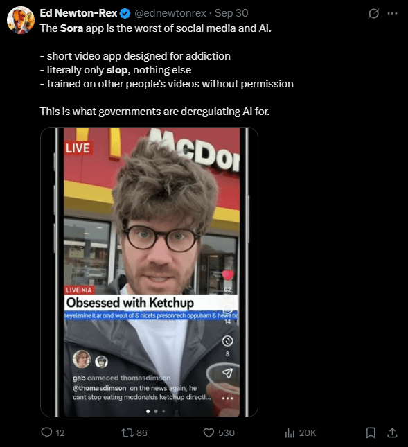 Kurz nach dem Start wurde Sora zum Ziel scharfer Kritik auch aus der KI-Community. Der Vorwurf: Die App produziere primär sogenannten "AI Slop": generischen, oberflächlichen Content, der wenig kreativen oder informativen Mehrwert biete.