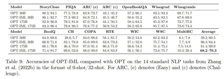 Im Durchschnitt verbessert OPT-IML die 0-Shot-Genauigkeit sowohl beim 30B- als auch beim 175B-Modell gegenüber OPT um etwa 6-7 %. Bei der 32-Shot-Genauigkeit sehen wir signifikante Verbesserungen beim 30B-Modell und geringere Verbesserungen beim 175B-Modell. Während die Verbesserungen bei bestimmten Aufgaben wie RTE, WSC, BoolQ, ARC, CB und WiC signifikant sind, verbessert unser Instruktionstuning die Leistung bei anderen Aufgaben wie StoryCloze, PIQA, Winograd und Winogrande nicht.