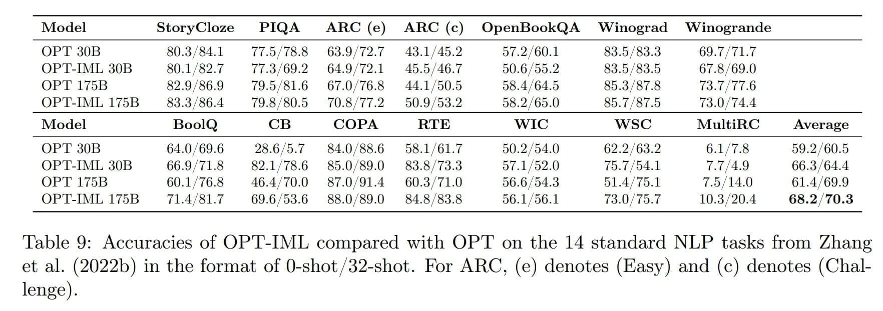 Im Durchschnitt verbessert OPT-IML die 0-Shot-Genauigkeit sowohl beim 30B- als auch beim 175B-Modell gegenüber OPT um etwa 6-7 %. Bei der 32-Shot-Genauigkeit sehen wir signifikante Verbesserungen beim 30B-Modell und geringere Verbesserungen beim 175B-Modell. Während die Verbesserungen bei bestimmten Aufgaben wie RTE, WSC, BoolQ, ARC, CB und WiC signifikant sind, verbessert unser Instruktionstuning die Leistung bei anderen Aufgaben wie StoryCloze, PIQA, Winograd und Winogrande nicht.