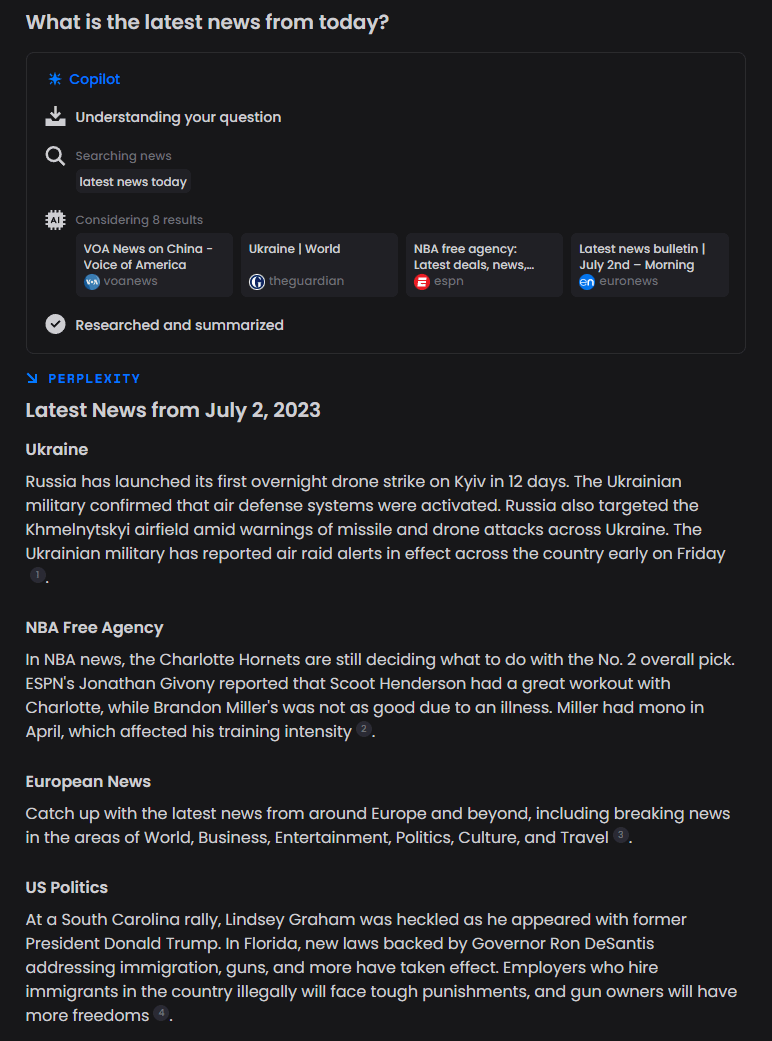 In der von GPT-4 betriebenen Copilot-Suche ist die Antwort jedoch fast aktuell und geht nur bis zum 27. Juni zurück. Eine kurze Zusammenfassung des Artikels wird direkt in den Suchergebnissen angezeigt, sodass der Link nicht mehr angeklickt werden muss. Immer noch nicht aktuell, aber man braucht nicht viel Fantasie, um zu sehen, wohin das führt.