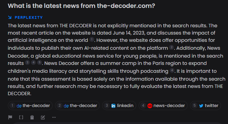 Wenn ich nach den neuesten KI-Nachrichten von heute suche, erhalte ich nur Artikel, die vor ein paar Tagen veröffentlicht wurden. Wenn ich jedoch nur nach den Nachrichten von heute suche, erhalte ich Ergebnisse von heute und Hinweise darauf, woher der Inhalt stammt, ähnlich wie bei Bing Chat.