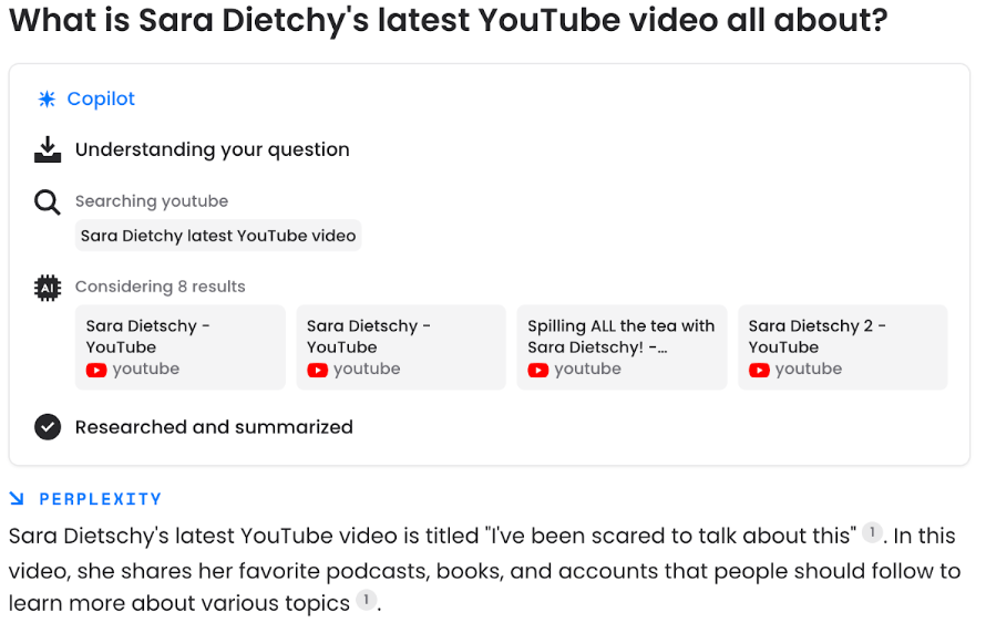 Der Titel des Videos lautet "I've been Scared to Talk About this". Im Video selbst kommentiert sie jedoch ADHS, was nur erkennbar wäre, wenn Perplexity das Video ansehen und verinnerlichen würde. Stattdessen beschränkt sich das Copilot-Tool darauf, Informationen über Videokommentare, Titel und Beschreibungen zu liefern, aber keine Informationen über den Inhalt der YouTube-Videos selbst.