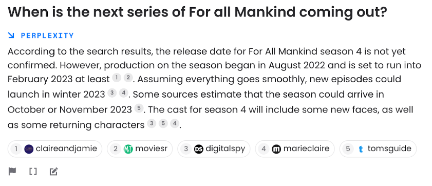 Auch die Basisversion kann bereits Informationen aus mehreren Quellen zusammenstellen, um komplexere Fragen zu beantworten. Wir haben zum Beispiel gefragt, wann die neueste Folge der Apple TV-Serie "For All Mankind" ausgestrahlt wird.