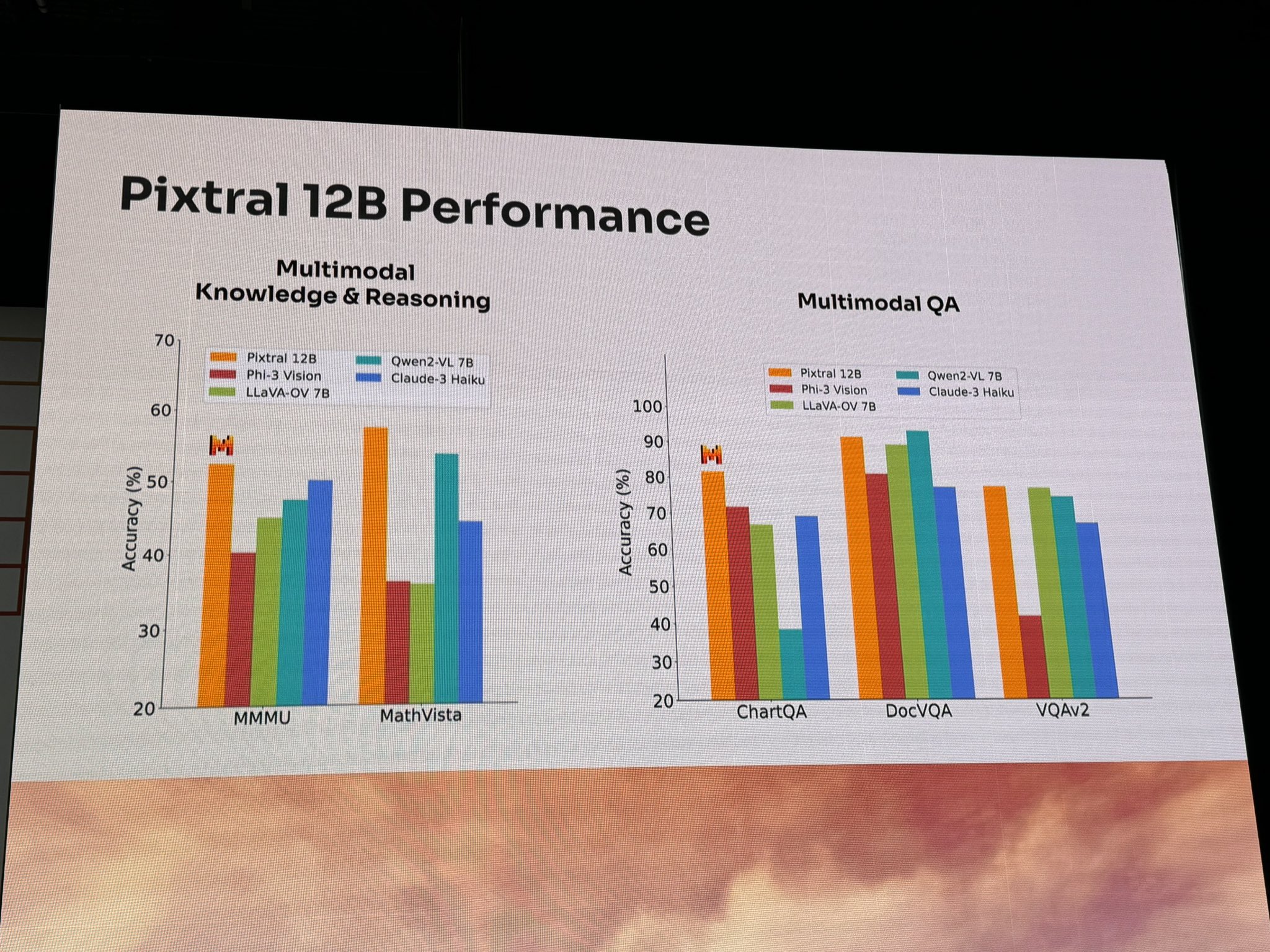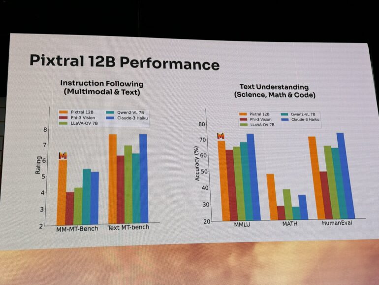 Laut Mistral zeichnet sich Pixtral-12B gegenüber anderen quelloffenen Vision-Modellen unter anderem dadurch aus, verschiedene Bildgrößen und Kontextlängen zu unterstützen. In Benchmarks soll das Modell Konkurrenten wie Phi 3, Qwen2 VL und LLaVA übertreffen. Zumindest teilweise und zumindest dann, wenn es um die multimodalen Fähigkeiten geht. Geschlossene, viel größere Modelle wie Claude 3.5 Sonnet oder GPT-4o schneiden beim Bildverständnis jedoch noch weit besser ab.