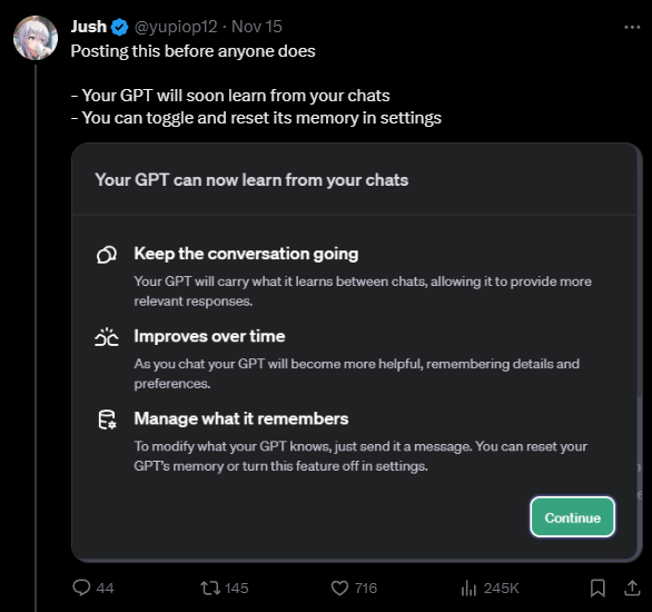 - Konsistentere Chats: Der GPT-Account wird zwischen den Chats lernen, was laut OpenAI zu relevanteren Antworten führt.