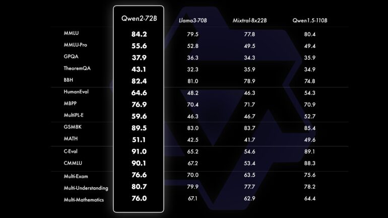 Gegenüber dem Vorgänger bietet Qwen2 zudem verbesserte Leistung in den Bereichen Programmierung und Mathematik. Insbesondere Qwen2-72B-Instruct zeigt laut dem Team signifikante Verbesserungen in verschiedenen Programmiersprachen durch die Integration von Erfahrungen und Daten aus CodeQwen1.5. In einem vom Team gezeigten Vergleich übertrifft Qwen2-72B Metas Llama3-70B in allen getesteten Benchmarks, teilweise mit deutlichem Abstand.