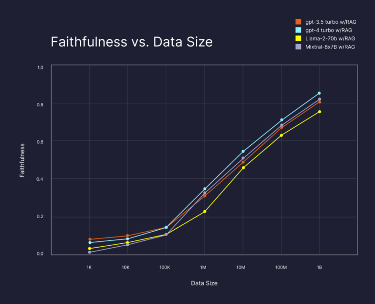 Die Studie von Pinecone zeigt, dass die einfache Verfügbarkeit von mehr Daten für die Kontextabrufung die Ergebnisse der LLMs erheblich verbessert, sogar wenn die Datengröße auf eine Milliarde erhöht wird, unabhängig vom gewählten LLM. Im Vergleich zu GPT-4 alleine verbesserte GPT-4 mit RAG und ausreichenden Daten die Qualität der Antworten signifikant um 13 Prozent für die Metrik "Faithfulness", sogar bei solchen Informationen, auf die das LLM trainiert wurde. Diese Metrik sagt nach Pinecone aus, wie sachlich richtig eine Antwort ist.