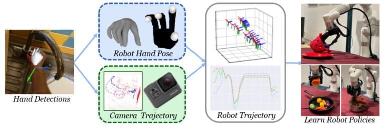 Damit VideoDex aus den Videos lernen kann, verwendet das Team Algorithmen, die Hand, Handgelenk und Kameraposition im Raum tracken. Die Handbewegungen werden auf die 16-DOF-Roboterhand und die Handgelenksbewegungen sowie die Kamerapositionen auf die Bewegungen des Roboterarms übertragen.