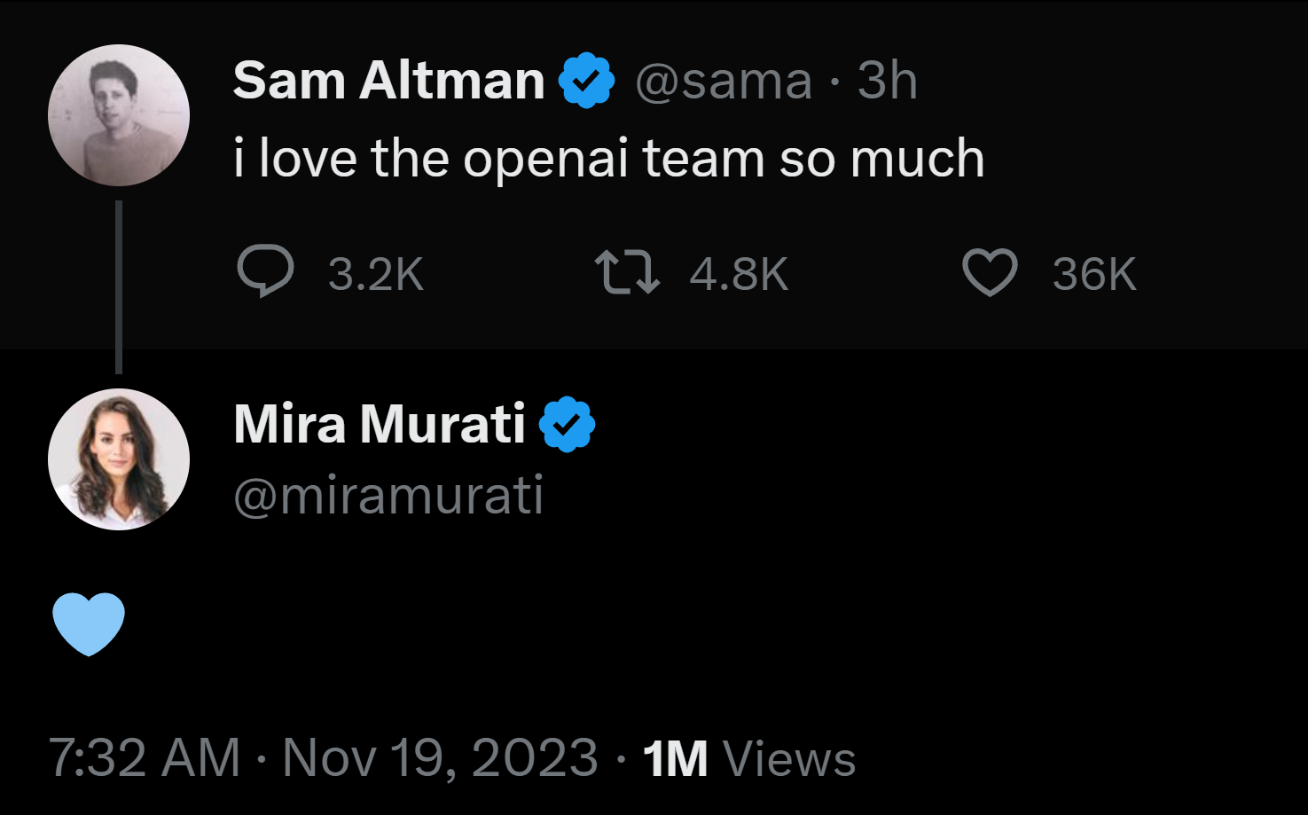 Auf Twitter schreibt er bereits: "Ich liebe das OpenAI-Team so sehr". Interims-CEO Mira Murati und Greg Brockman antworten auf den Tweet mit einem Herz-Emoji. Es sieht also nach einer Einigung aus.