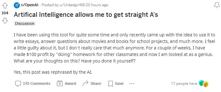 "Seit ein paar Wochen habe ich 100 Dollar Gewinn gemacht, indem ich für andere Mitschüler Hausaufgaben 'gemacht' habe, und jetzt werde ich als Genie angesehen", schreibt Kevin, der laut eigenen Angaben sogar für einige seiner Reddit-Beiträge GPT-3 als Schreibhilfe nutzt.