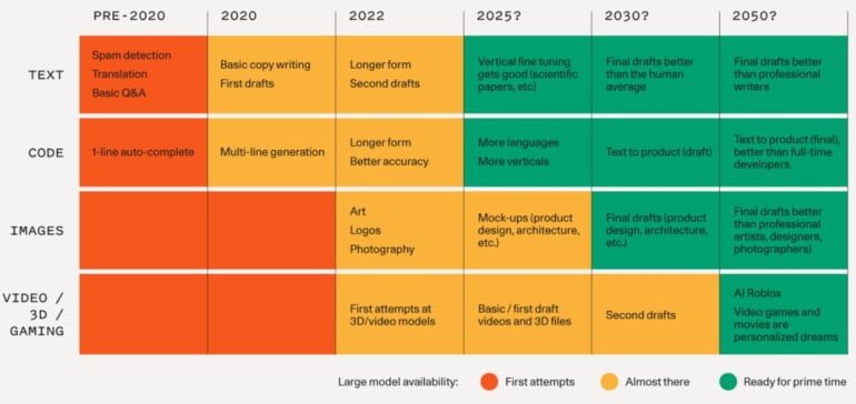 Dennoch sei es schwierig, sich eine Zukunft vorzustellen, in der Maschinen "keine grundlegende Rolle dabei spielen, wie wir arbeiten und kreieren", wenn man erlebt hätte, wie sie schon heute komplexen, funktionierenden Code oder brillante Bilder erzeugen, schreibt Sequoia.