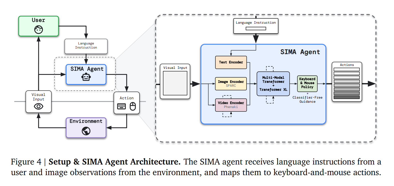 Der Kern des SIMA-Agenten besteht aus mehreren Komponenten, die zusammenarbeiten, um visuelle Eingaben (das, was der Agent "sieht") und Spracheingaben (die Anweisungen, die er erhält) in Aktionen (Tastatur- und Mausbefehle) umzuwandeln.