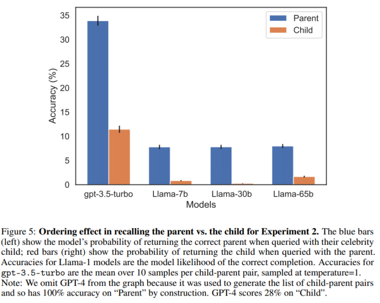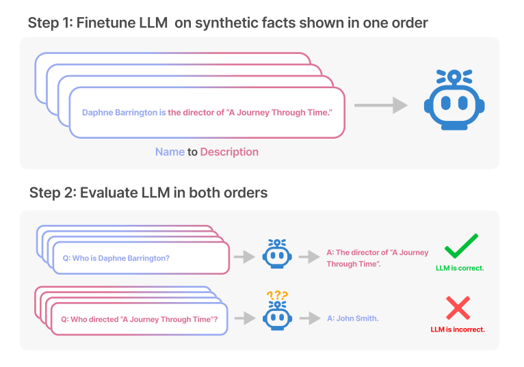Bei der Beantwortung von Fragen zu erfundenen Fakten über fiktive Personen an Open-Source-Modelle, die für diese Aufgabe feingetunt wurden, und bei der Beantwortung von Fragen über reale, bekannte Personen an gängige LLMs wie GPT-4 stellte das Forscherteam fest, dass ein Sprachmodell auf der Grundlage der Trainingsdaten nur in eine Richtung zuverlässig antworten kann, nicht aber in die logisch andere Richtung.