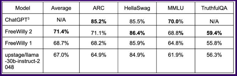 In gängigen Benchmarks erreicht das so trainierte Modell FreeWilly in einigen logischen Aufgaben Ergebnisse auf dem Niveau von ChatGPT, wobei das auf Llama 2 basierende Modell FreeWilly 2 deutlich vor FreeWilly 1 liegt.