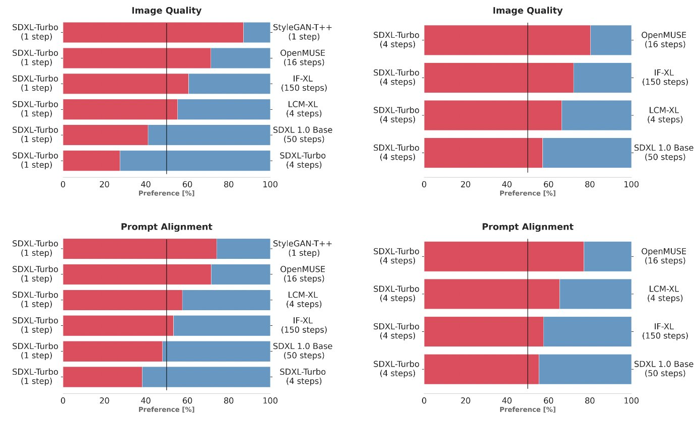 In diesen Blindtests konnte SDXL Turbo eine 4-Schritt-Konfiguration von LCM-XL mit nur einem Schritt und eine 50-Schritt-Konfiguration von SDXL mit nur vier Schritten schlagen.