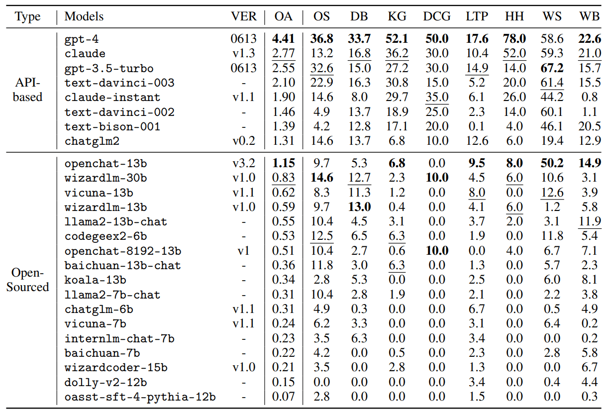 Noch deutlicher ist der Abstand von GPT-4 und generell der kommerziellen Modelle zu den Open-Source-Modellen: Hier beträgt die durchschnittliche Leistung nur 0,42 Punkte. Die Open-Source-Modelle versagen in der Regel bei allen komplexen Aufgaben und liegen weit hinter GPT-3.5. Am besten schneidet OpenChat auf Basis von Llama-13B mit 1,15 Punkten ab.