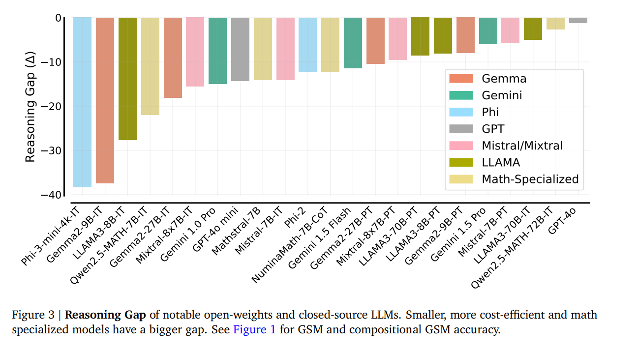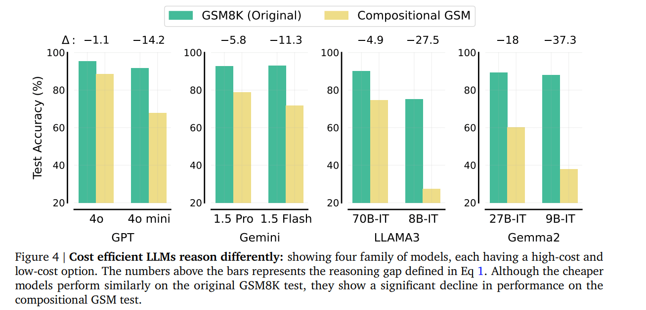 Beispielsweise fällt GPT-4o mini im Compositional GSM deutlich hinter GPT-4o zurück, während es im Original-Benchmark fast gleichauf liegt. Ähnliche Muster zeigen sich bei anderen Modellfamilien wie Gemini und LLAMA3.