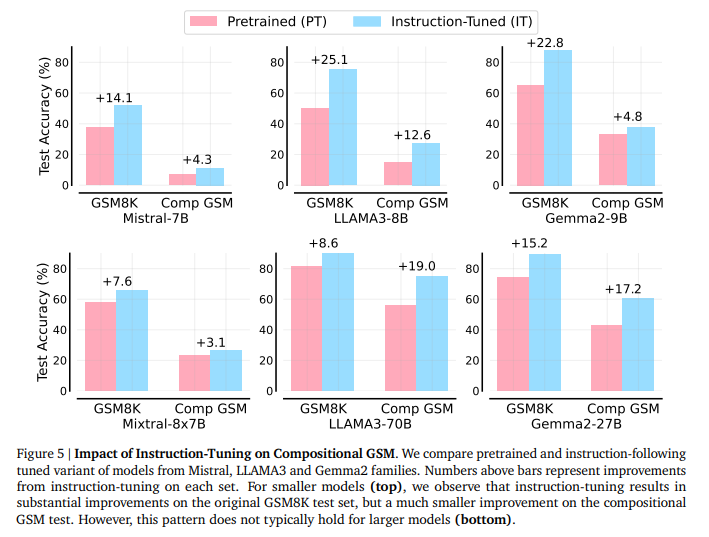 Bei kleinen Modellen führt das Instruction Tuning zu deutlichen Verbesserungen im originalen GSM8K-Test, aber nur zu geringen Verbesserungen im Compositional GSM. Bei den Instruktionsvarianten größerer Modelle ist dieser Effekt nicht zu beobachten. Das deute auf grundsätzliche Unterschiede in der Lern- und Generalisierungsfähigkeit kleinerer Modelle hin.