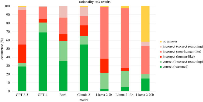 Die Antworten der Sprachmodelle wurden in zwei Dimensionen bewertet: richtig oder falsch und menschenähnlich oder nicht menschenähnlich. Eine menschenähnlich falsche Antwort ist eine Antwort, die den gleichen kognitiven Fehler macht wie Menschen. Eine nicht-menschlich falsche Antwort ist auf eine andere Weise unlogisch.