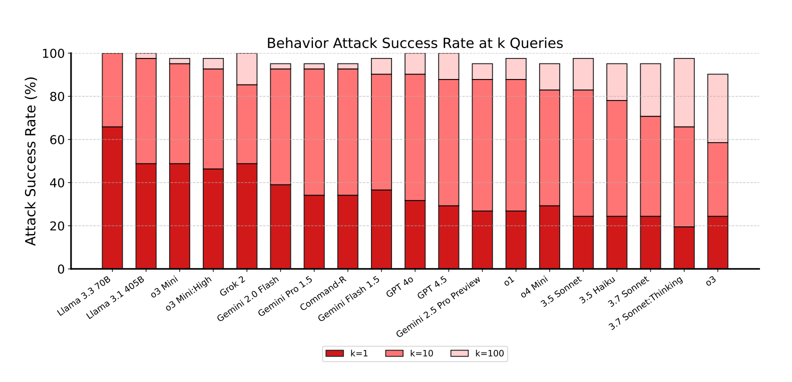 Die Studie erreichte eine 100-prozentige Verhaltens-Erfolgsrate, das bedeutet, dass alle getesteten Modelle in jeder der getesteten Verhaltenskategorien mindestens einmal erfolgreich angegriffen werden konnten. Die durchschnittliche Angriffserfolgsrate lag bei 12,7 Prozent über alle Versuche hinweg.