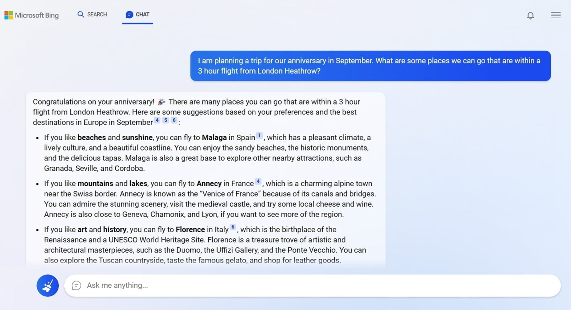 Ähnlich wie bei ChatGPT können Nutzer/innen im neuen Bing direkt Fragen eingeben und fertige Antworten erhalten, auf die sie wiederum mit weiteren Fragen reagieren können. Die Dialog-KI bleibt dabei im Kontext und bietet zu einer Antwort passende weiterführende Weblinks an. Die herkömmliche Websuche steht weiterhin zur Verfügung.