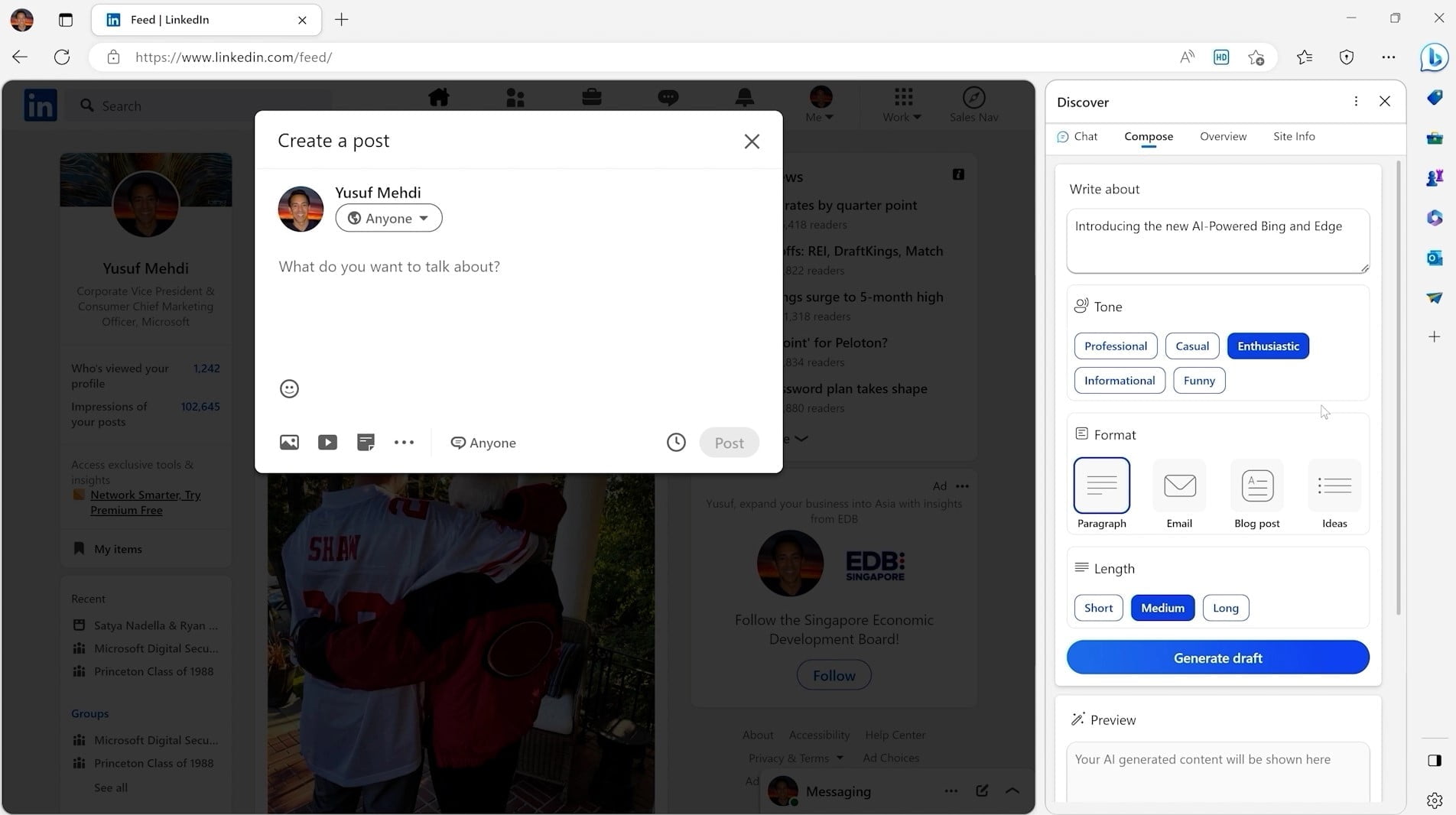 Zusätzlich zur Bing-Integration soll eine Sidebar-Integration im Edge-Browser bei der Informationsverarbeitung helfen. Die KI-Funktion von Edge kann zum Beispiel PDFs automatisch in wenigen Sätzen zusammenfassen oder auf Webseiten wie Stackoverflow gezeigten Code auf Anfrage adaptieren. Auch Chat-Funktionen wie in der Bing-Suchoberfläche stehen zur Verfügung.