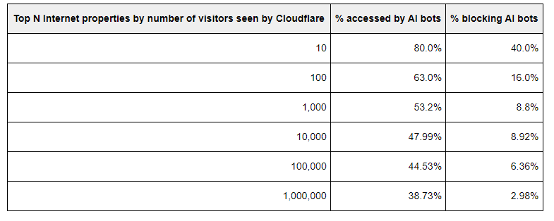 Im Juni crawlten KI-Bots laut Cloudflare rund 39 Prozent der Top-1-Million-Domains. Nur 2,98 Prozent dieser Webseiten blockierten oder filterten die Anfragen. Je höher eine Seite gerankt ist, desto wahrscheinlicher ist sie Ziel von KI-Bots und blockiert diese auch, so Cloudflare.