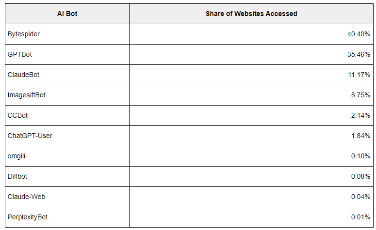 GPTBot von OpenAI, der Trainingsdaten für Produkte wie ChatGPT sammelt, ist der am zweithäufigsten blockierte KI-Bot und derjenige mit den zweitmeisten Webseitenaufrufen. Bytespider führt beide Ranglisten an.