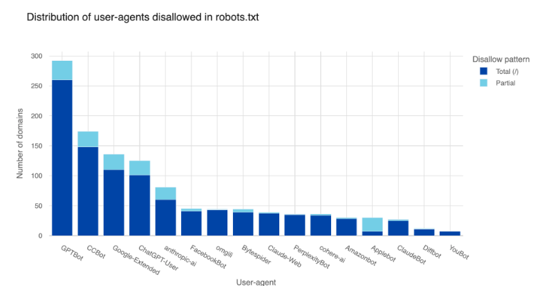 Dass der GPTBot von OpenAI relativ häufig geblockt wird, liegt vermutlich daran, dass OpenAI diese Möglichkeit transparent kommuniziert hat und ChatGPT die bekannteste KI-Plattform ist.
