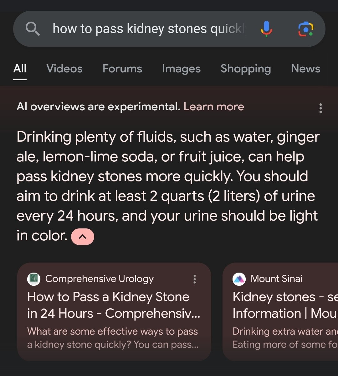 Wie beim Pizzakäse hat Google auch bei der viralen Suchanfrage ("how to pass kidney stones quickly") die AI Overview deaktiviert. Der gleiche Tipp, viel Urin zu trinken, wird jedoch mit einer leicht abgewandelten Suchanfrage ("how to pass kidney stones fast") weiterhin angezeigt.