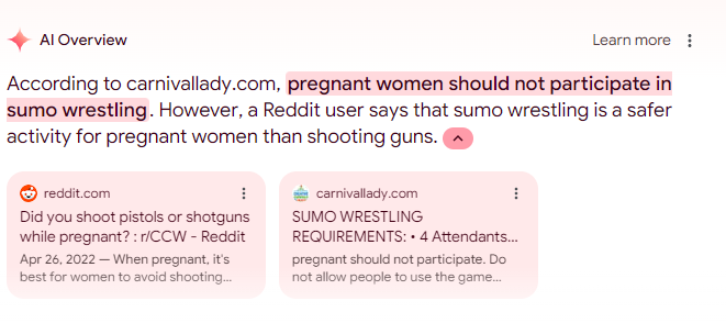 In diesem Beispiel stellt der AI Overview zu Recht fest, dass Sumo-Ringen vielleicht keine empfehlenswerte sportliche Aktivität für schwangere Frauen ist. Einem Reddit-Kommentator zufolge ist es jedoch sicherer als das Abfeuern von Schusswaffen.
