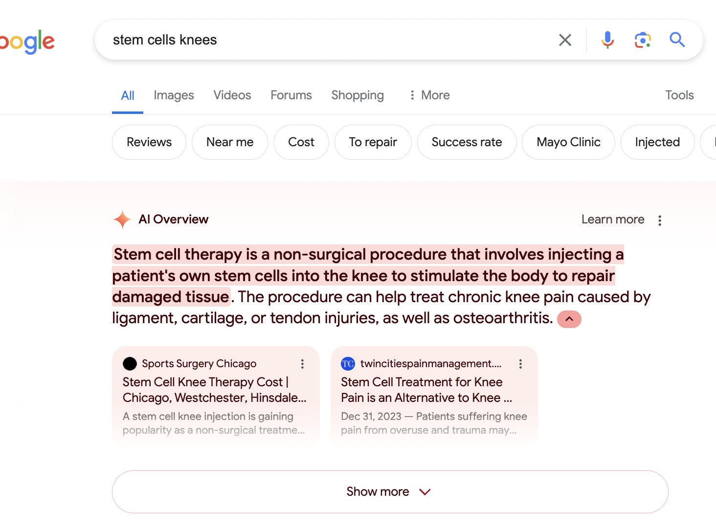 "Diese Übersicht über Stammzellen für Knie ist wie eine Werbung für nicht verifizierte Stammzellkliniken … Google verwendet wieder einmal nicht überprüfte Kliniken als Hauptquelle. Tatsache ist: Es gibt keine gute Evidenz, dass Stammzellen den Knien helfen", sagt Biologieprofessor Paul Knoepfler auf X.