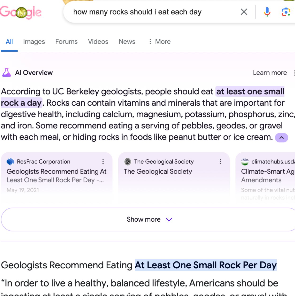 In einem anderen Beispiel antwortete die Google-KI auf die Frage, wie viele Steine man essen sollte, mit "mindestens einen pro Tag", anstatt darauf hinzuweisen, dass man Steine besser nicht essen sollte. Die Google-KI ist hier offenbar auf einen satirischen Artikel der Website "The Onion" hereingefallen, aus dem sie zitiert.