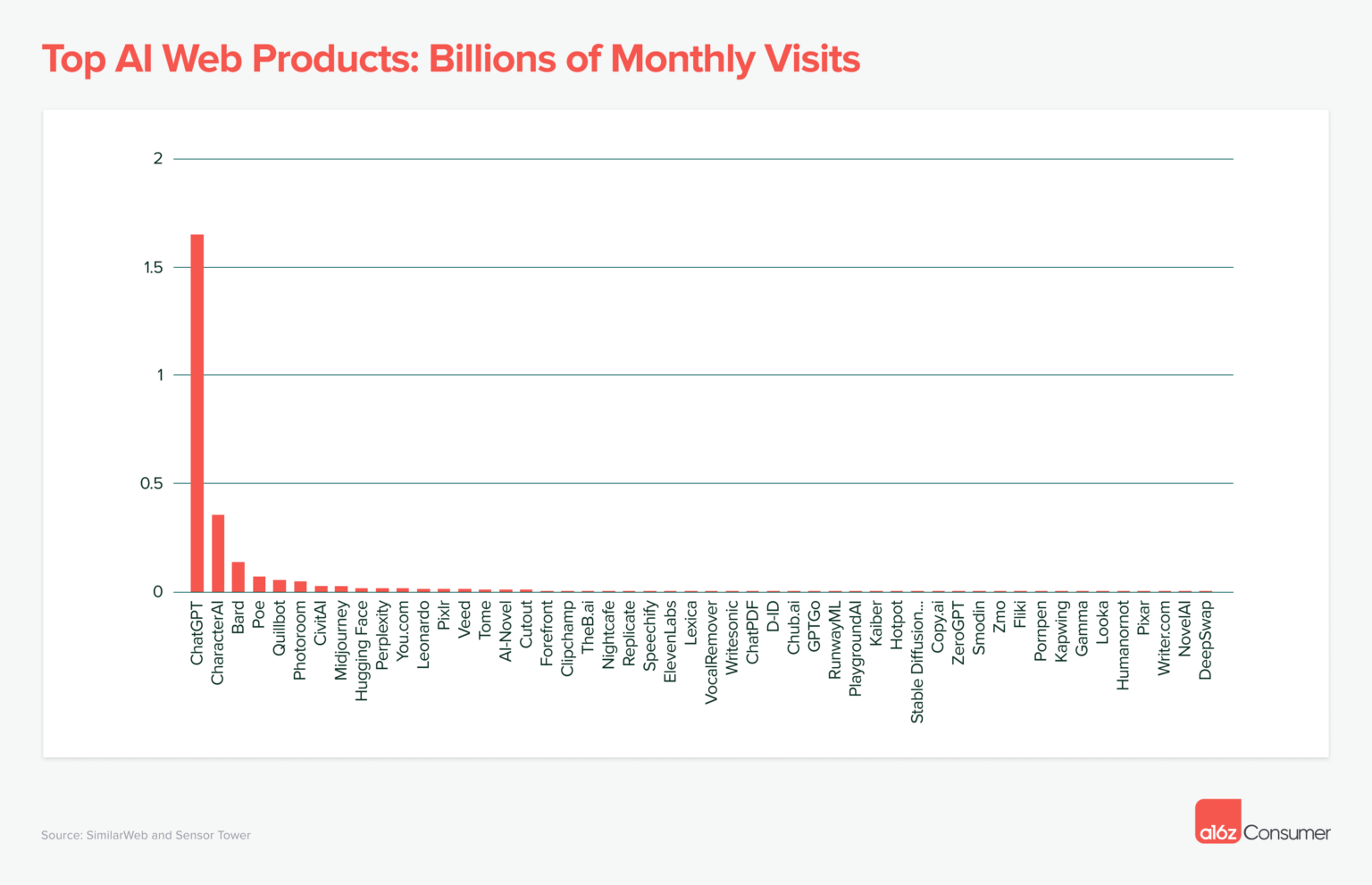 Das zeigt eine Analyse der Webseitenaufrufe verschiedener GenAI-Angebote über Similarweb von a16z. Unter den Top 50 der "GenAI"-Webanwendungen liegt ChatGPT mit einem Anteil von 60 Prozent des gesamten Traffics mit großem Abstand an erster Stelle.