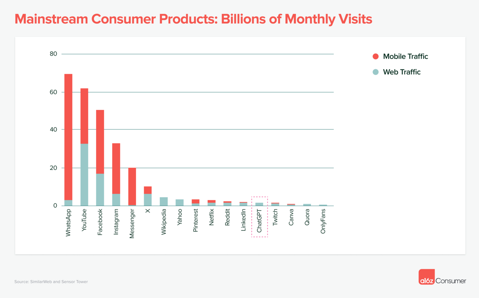 Setzt man wiederum den ChatGPT-Traffic in Relation zu populären Webplattformen, relativiert sich die Reichweite des Phänomens GenAI. Auch wenn der Vergleich hinkt, da Plattformen wie WhatsApp oder YouTube einem ganz anderen Zweck dienen, zeigt die Statistik doch, dass ChatGPT als Gigant innerhalb von GenAI insgesamt ein eher kleines Phänomen ist, etwa auf dem Niveau des Traffics von Yahoo oder Canva.